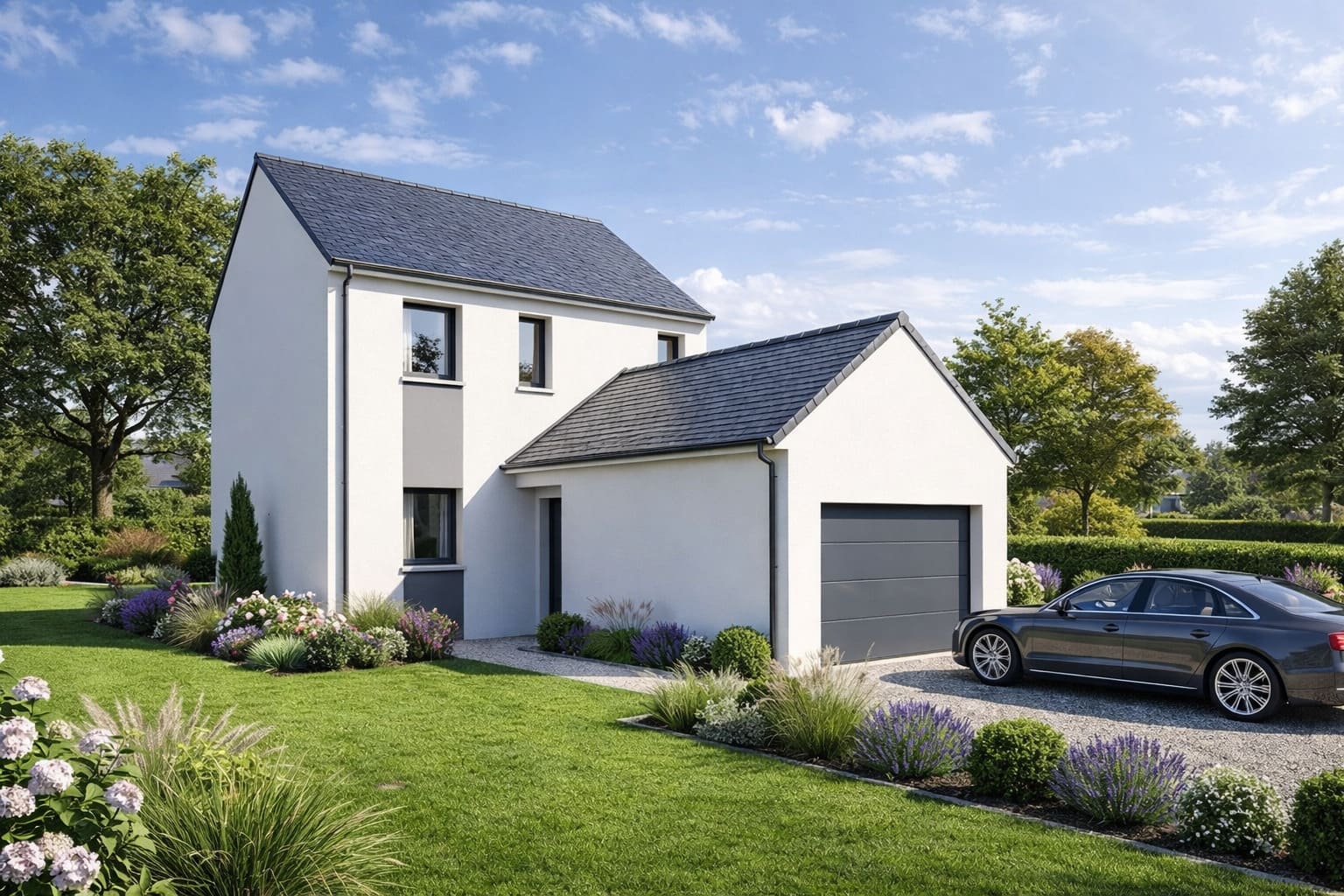 Cette maison neuve est basse consommation et conforme à la réglementation environnementale RE2020, garantissant ainsi une habitation respectueuse de l’environnement et des économies d’énergie substantielles.